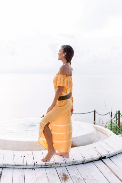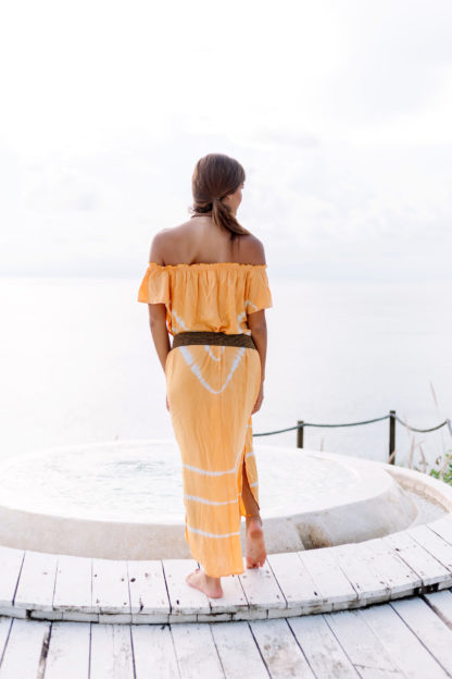 Cette robe longue hippie chic s’inspire du boubou africain pour la forme, et de la technique indonésienne du Tie and Dye pour l’impression. Livrée avec sa fine ceinture coupée dans le même tissu, fini par un joli pompon ton sur ton, sur les photos la robe est portée avec une ceinture perle et bois.